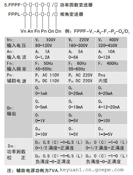 三、功率因数变送器的选型示意图以及系列型号 Model:FPPF-V1-A2-F1-P2-O3/D1